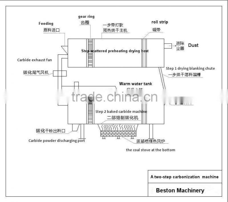3. The upper part of our machine adopts edge driving and centre screening double drive and stepless speed change structure. The structure can compulsorily change the materials into fine powder in the flash steaming and drying chamber, so the materials can fully contact the hot air, and the controllable rotating speed enable us to control the contacting time of materials and hot air. Then we can get material with the same humidity although their initial humidity is different. After drying, the material will automatically flow into the carbonizing machine in the lower part. The upper part of the machine is for drying material and the lower part is for carbonizing the material.