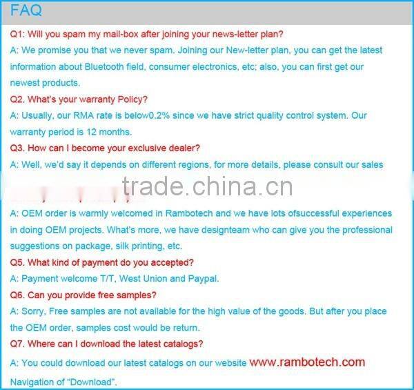 With years of export experience along with excellent quality, advanced services and competitive prices, Rambotech has won numerous customers' trust and support. We specialize in designing and developing innovative bluetooth wireless products, extend products to mobile phone accessories and computer peripherals.