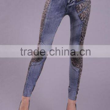 2016 Fashion Leopard Print Denim Stitching Design Women Skinny Denim Jeans
