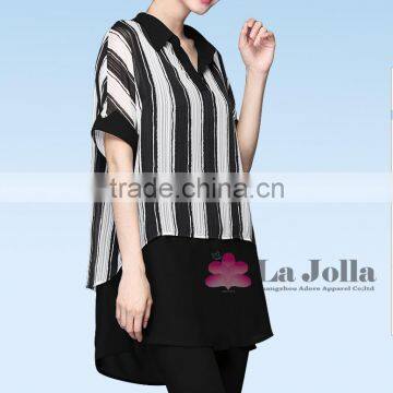 Lastest Summer Fashion White Black Stripes Short Sleeves False Two-piece Chiffon T-shirt 100