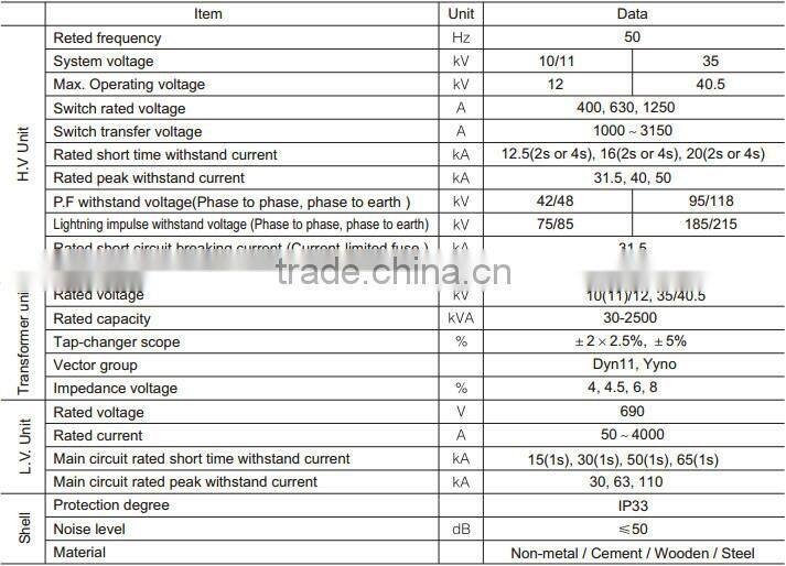 In normal time, the wind turbine output voltage is 690V, so it must be boosted to transmit far away. The wind farm usually use the cable to connect wind generator to wind power special prefabricated substation, boosting the voltage from 690V to 40.5kV, then transmit the power to wind farm's core substation, the core substation will boost the voltage again then connect to state power grid. The wind generator and packaged boosting transformer integration adopt one generator-one transformer unit wiring. This type prefabricated substation is designed and exploited according to this requirement.