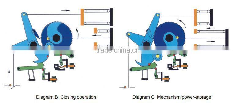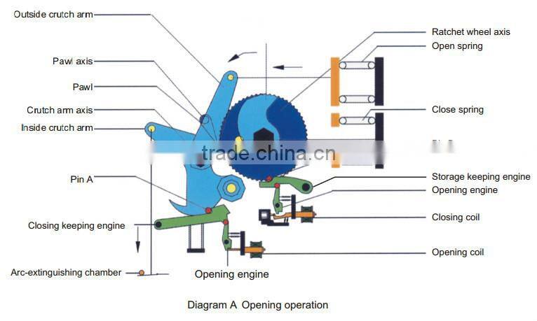Diagram A: After circuit breaker is closed, the close and open spring store energy, inside crutch arm and outside crutch arm be ar moment from anti-clockwise, once the opening winding electrified, the lock releases and rotate in anti-clockwise driving by open spring, and inside crutch arm open circuit breaker. The moment is locked up by keeping engine and engine under opening state. (On diagram B)