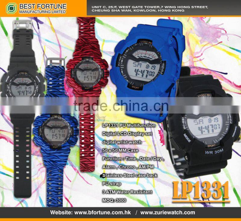 LP1331 Blue PU Multifunction Digital LCD Display Printing Graphic Pattarn Set Digital Wrist G Watch