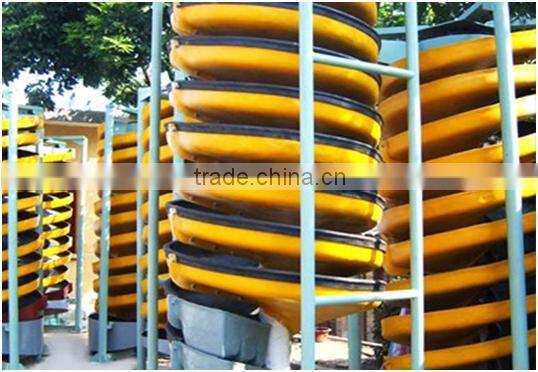 Spiral chut suits the fine size ores with particle size of 0.3-0.02mm, such as iron, ilmenite, chromite, brasses, zirconite, rutile, monazite, xenotime, tungsten, tin, tantalum, niobium and other ferrous metal with the different gravity property. It owns of the features of steadily working condition, easy controlling, big changes in scope of feeding density, rich concentration ratio, high recovery rate, small cover area, low water consumption, simple structure, free power, big capacity, simpler installation, convenient operation, less investment but high efficiency, etc.