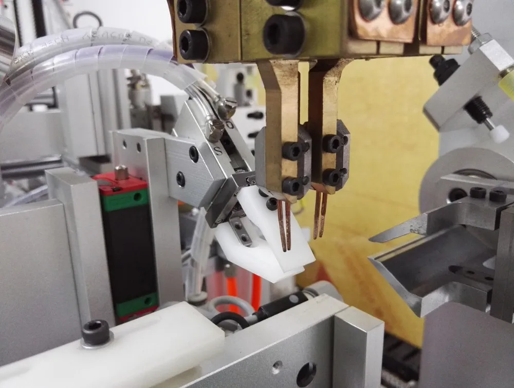 is used to spot weld pcb with "L" shaped nickels to battery cells. It's designed fully automatic in operation, each process works independently with manipulators. Spot weld fastly up to about 1200-1500pcs/h.
