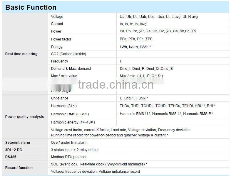 Pulse output | Pulse constant: 1000~9999 programmable Pulse width: 60~100ms programmable Formula: 1 pulse = (1÷ pulse constant ×PT ×CT) kWh | |