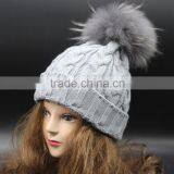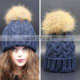 Hot Popular Real Raccon Fur Pompom Women Kintted Winter Wool Caps And Hats