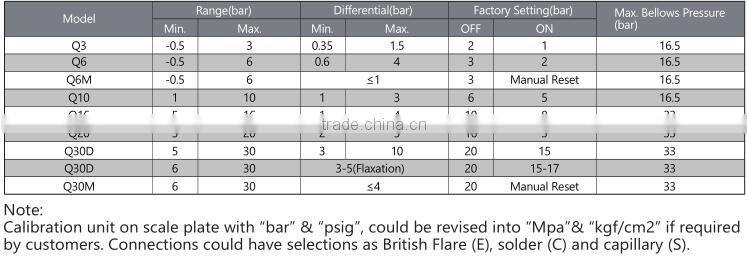 • Q series single pressure controls can be not only used in fluorinated refrigerant, but also in the air and liquid (allowed liquid temp. -20 to 120°C)