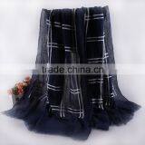Wholesale Korean Fashion Woman Checked Plaid Embroidery Design Tassel Wide Voile Cotton Scarf