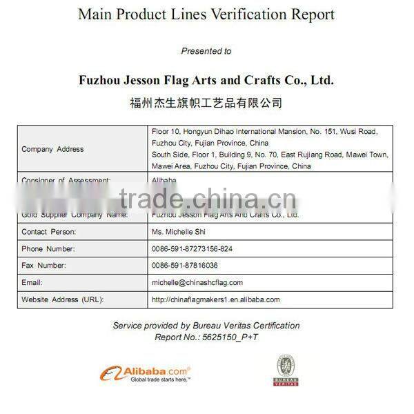 We are a leading flag manufacturer in China, with more than 10 years' history in flags supply with effective management system and good after-sales service, and yes the excellent good quality and punctual delivery. We have enjoyed a high reputation in the world market and approbated by all of our long-term relation customers. You can find our full product scope here:
