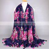 Charm Flower Printing High Density Voile Head Scarf With Tassels