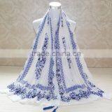 Autumun Winter Fashion Blue And White Porcelain Printing Cotton Pashmina Scarf With Tassel