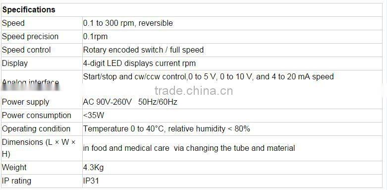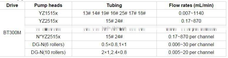 This product can be installed by YZ1515x,YZ2515x,DG-1 and ZN25 four kinds of pump heads, with flow rate from 0.007-380mL/min. Flow speeds can be adjusted either by hand through switching knobs, instead of the traditional way of membrane keypad, which reduces obviously the failure rate, or by automatic control through the external controller interface, with three available modes: 0-5V, 0-10V and 4-20mA. Memory function is also available in the product in case of power off. Besides, switching knobs are designed clearly so that it is easy to operate for customers.