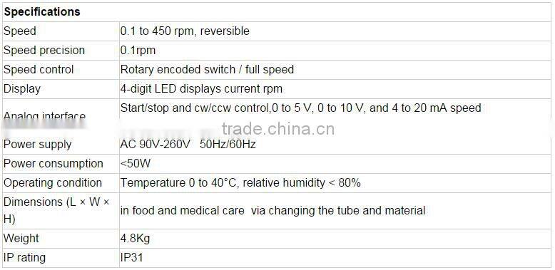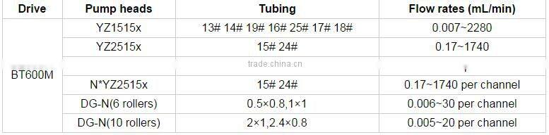 This product can be installed by YZ1515x,YZ2515x,DG-1 and ZN25 four kinds of pump heads, with flow rate from 0.007-380mL/min. Flow speeds can be adjusted either by hand through switching knobs, instead of the traditional way of membrane keypad, which reduces obviously the failure rate, or by automatic control through the external controller interface, with three available modes: 0-5V, 0-10V and 4-20mA. Memory function is also available in the product in case of power off. Besides, switching knobs are designed clearly so that it is easy to operate for customers.