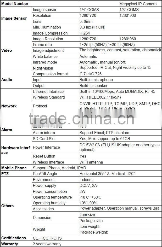- Built-in WIFI module, Wifi 802.11b/g/n, TCP/IP,UDP,IMCP,SMTP,HTTP,FTP,DHCP,DDNS,UPNP,PPPoE etc