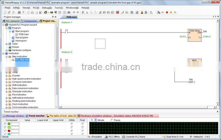 HaiwellHappy is a very easy to study PLC programming software. It complied with IEC 61131-3 standard, supports unique 100% built-in simulator, and LD-Ladder Diagram, FBD-Function Block Diagram and IL-Instruction List 3 programming languages.