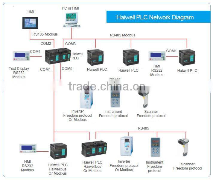 Haiwell PLC is built with rich network communication function. The CPU host built two communication ports, which can be expandable to five communication ports, each port can be programmed and connects to network, and all of them can be used as masters or slaves.