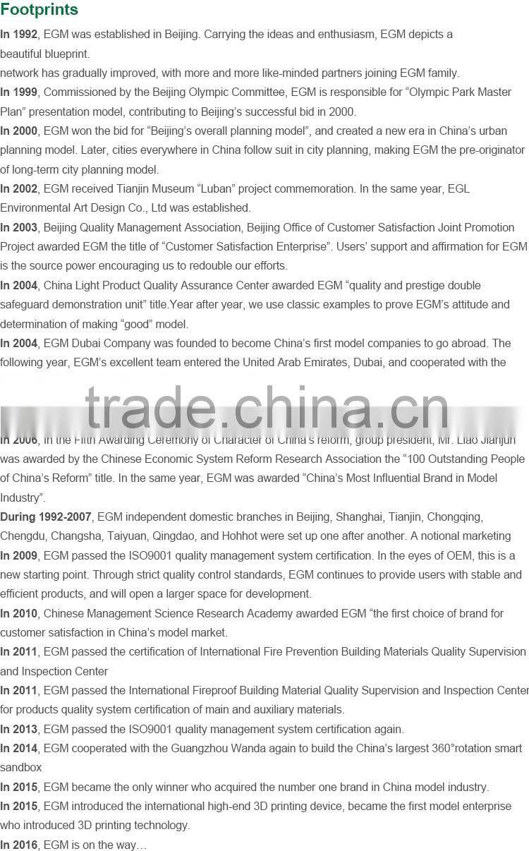 Eastern Ground Model (EGM) was founded in 1992. It has established 17 branches in Shenzhen, Beijing, Chongqing, Taiyuan, Shanghai, Xi’ an, Changsha, Qingdao, Huhhot, Kunming, Changchun, Shenyang, Dubai, Saudi and New Zealand as yet. Eastern Ground Model (EGM) is the first company in the industry to pass the ISO9001 quality management system certification, and to research & develop and use the world leading level 3D print equipment. Meanwhile, it is the first model company to go abroad.