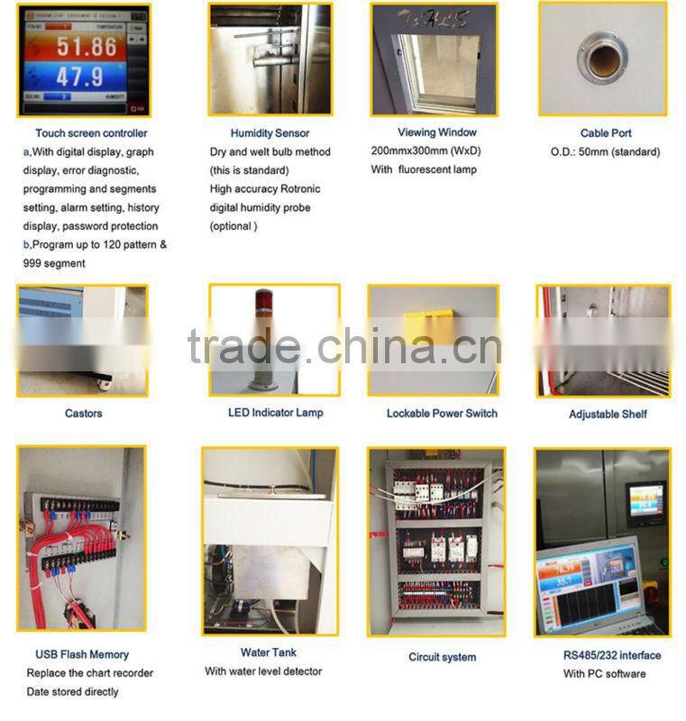 | Standard Accessoriesparts | 1 Observe window(double-deck cavity toughened glass),50mm testing hole,PL internal bulbs,partition plate,dry and wet ball gauze,3 fuses,1 power line | |||||||||