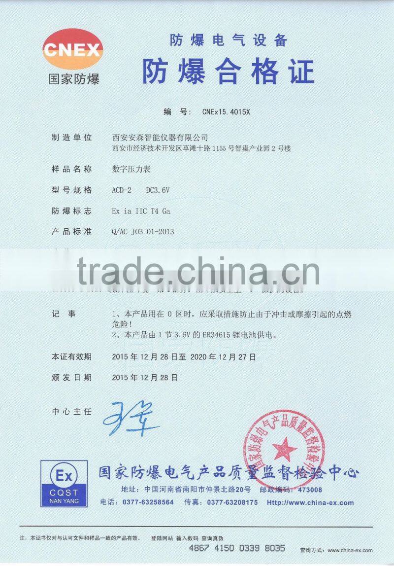 ACD-Z3 Wireless Pressure Gauge adopts the latest advanced micro power consumption intelligent instrument, the standby lithium battery is built-in, which could work 5 to 8 years continuously, the WVA segment type code and liquid crystal display window with large screen is adopted. The readings are distinctive and clea r. The construction can be selected from radial direction type, axial direction type and panel mounting type.