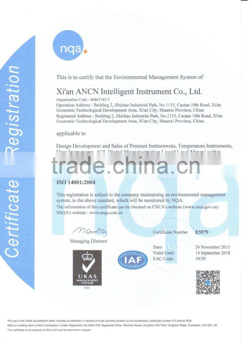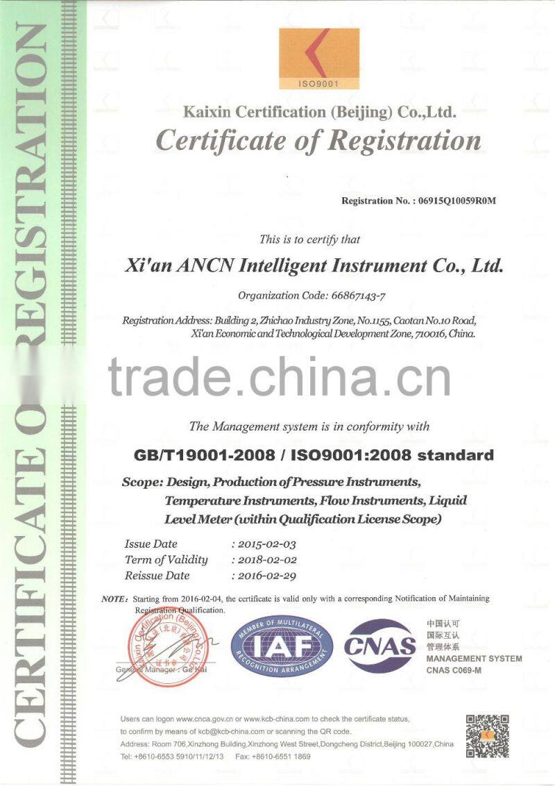 Established in 2007, city of Xi’an-China, Xi'an ANCN Intelligent Instrument Co.,Ltd. is a manufacturer, exporter of intelligent industrial instruments. Instruments are digital flow meter, liquid meter, wireless-communication instruments network, pressure gauge , thermometer, self-monitoring instruments network for oilfield production, and related software. We have passed the ISO9001:2008 quality recognition system, registered the brand name as “ ANCN” and obtained multinomial patents as well as intellectual property. Our instruments are supplied to a wide range of industries applications including measuring, petroleum , chemical, electric power, mineral , gas, welding, medical, food processing, petrochemical and other industries.