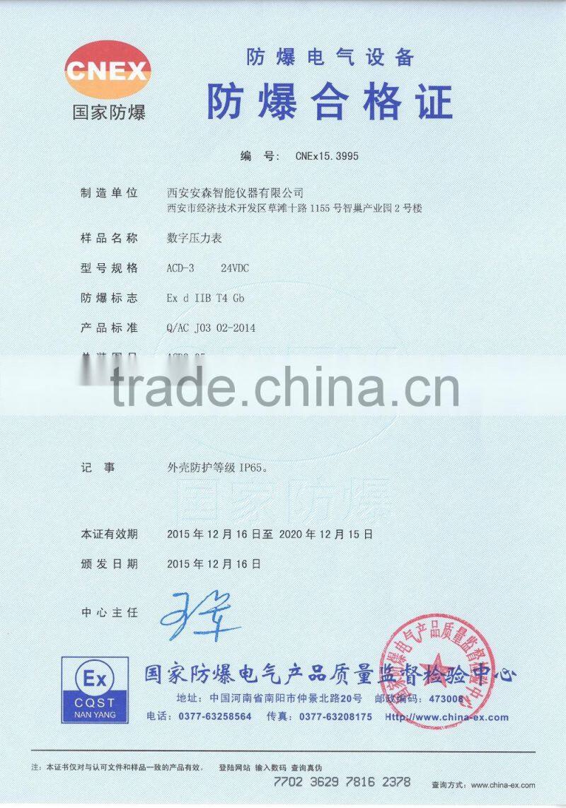 Established in 2007, city of Xi’an-China, Xi'an ANCN Intelligent Instrument Co.,Ltd. is a manufacturer, exporter of intelligent industrial instruments. Instruments are digital flow meter, liquid meter, wireless-communication instruments network, pressure gauge , thermometer, self-monitoring instruments network for oilfield production, and related software. We have passed the ISO9001:2008 quality recognition system, registered the brand name as “ ANCN” and obtained multinomial patents as well as intellectual property. Our instruments are supplied to a wide range of industries applications including measuring, petroleum , chemical, electric power, mineral , gas, welding, medical, food processing, petrochemical and other industries.