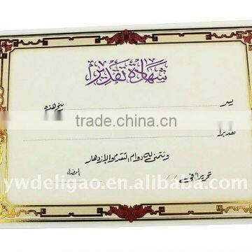 Heart Paperboard for Arabia Honor Certificate, Embossed Fashional Print and Hot Stamping