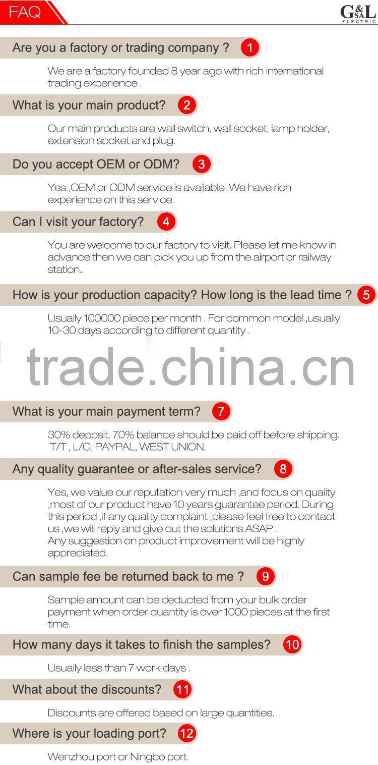 Wenzhou BOZ Electric Appliance Co., Ltd is a professional manufacturer and exporter,specializing in producing and developing of all types of wall swithes and related products. Our factory mainly include switches and sockets,lampholder,adapters and plugs, etc. We can also design and manufacture power supply products according to the various demands of different customers. Located in wenzhou, a coastal and important commercial city in East China,we possess a convenient location which is near wenzhou airport and wenzhou seaport.
