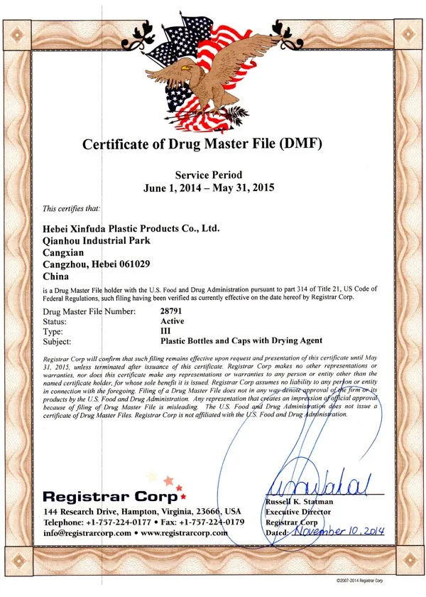 The Administrative Measures of Medicinal Packaging Material and Container,Hebei Xinfuda Plastics products Co., Ltd is approved by SFDA to Produce Oral Medicinal High Density Polyethylene Bottle.