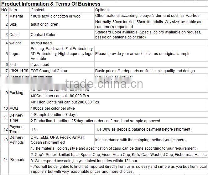 4). Our factory has more than 200 employees for production. Superb technology, modern production methods, good after-sales service and make the aim "Customize your own hat" come true.