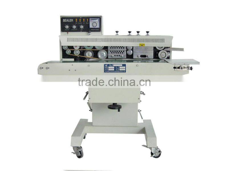 Brief introduction: FRM-1100 Series coding continuous sealer can be applied to all the heat sealing materials. Adjustable stepless speed, constant temperature controlling, and adjustable temperature, Height of conveyor is adjustable and adapt to very wide range. While sealing the machine use solid-ink printing color label, which is readable, color can be chosen, instant dry since printing, strong adhesion and with a suitable R-type or T- type arrangement of dual-use printing wheel, can be printed R type 2 line 4 words (PT18) or three lines on the 5th word (PT10.5), FRM-1100 series has several models for selection. |