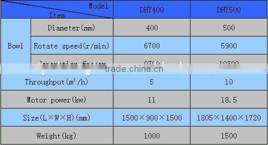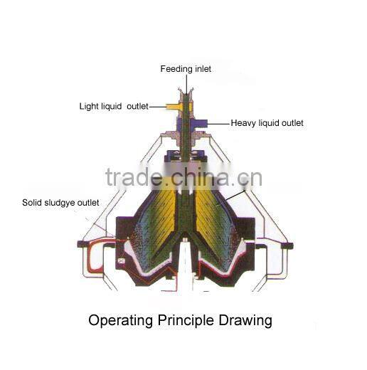 The bowl rotates at a high speed round the main axis, driven by a motor through hydraulic coupling and screw gear pair. stock liquid flows from the upper feeding pipe into the bowl's bottom and then will be separated through holes of disc seat. by the action of centrifugal force field, heavy liquid flows along the inner wall of discs to the inner wall of the bowl, after up flowing along them, it will be discharged by the heavy liquid pump, the light liquid will be done by the light liquid pump, which flows along the inner wall of discs into centre pipe and then up to high liquid outlet. the larger solid phase particles left will sedimentate on the bowl's wall and then will be discharged, controlled by the sliding bowl, out of the sediment outlet.