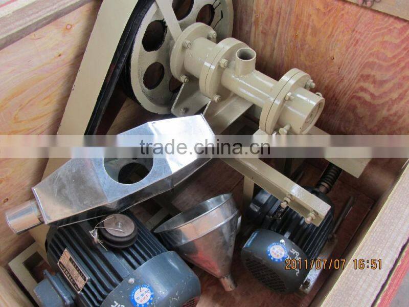 There is no need to heat outside the fish feed Feed extruder, through the screw extruding of the raw material, produces heat during the rotary working process, and gathers heat in the airtight environment to reach ripening, during the high temperature ripening process, the starch and fiber of the raw material become swell, on the pressure-tight condition, spray up from the mold outlet through the high pressure produced by the regular rotating of the screw, after cutting by the forepart cutter which rotates regularly and high-speedily, the finished product will be shrunk and become small average ball.