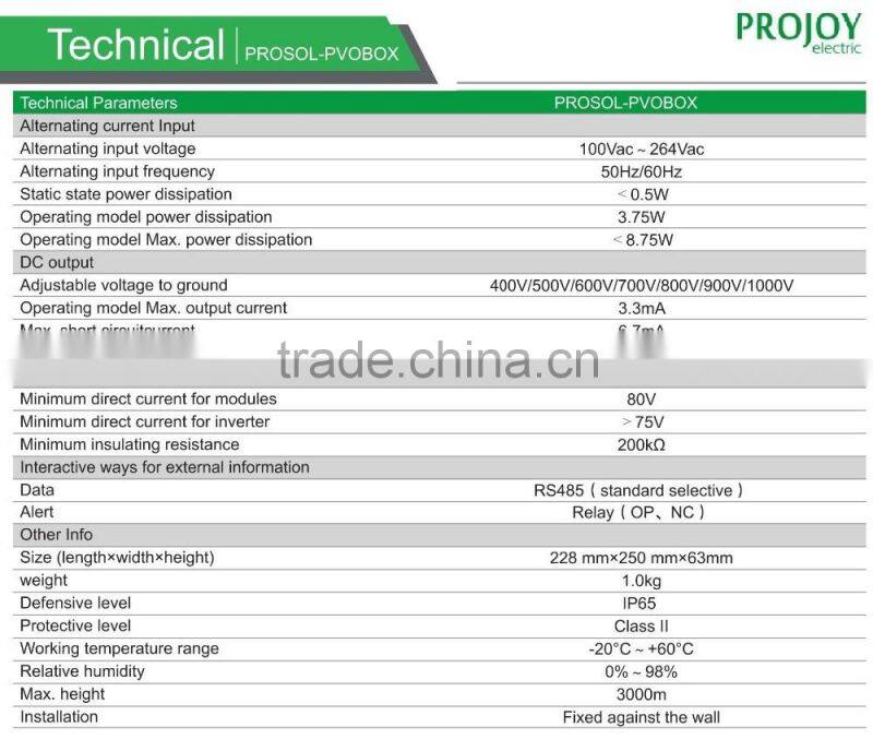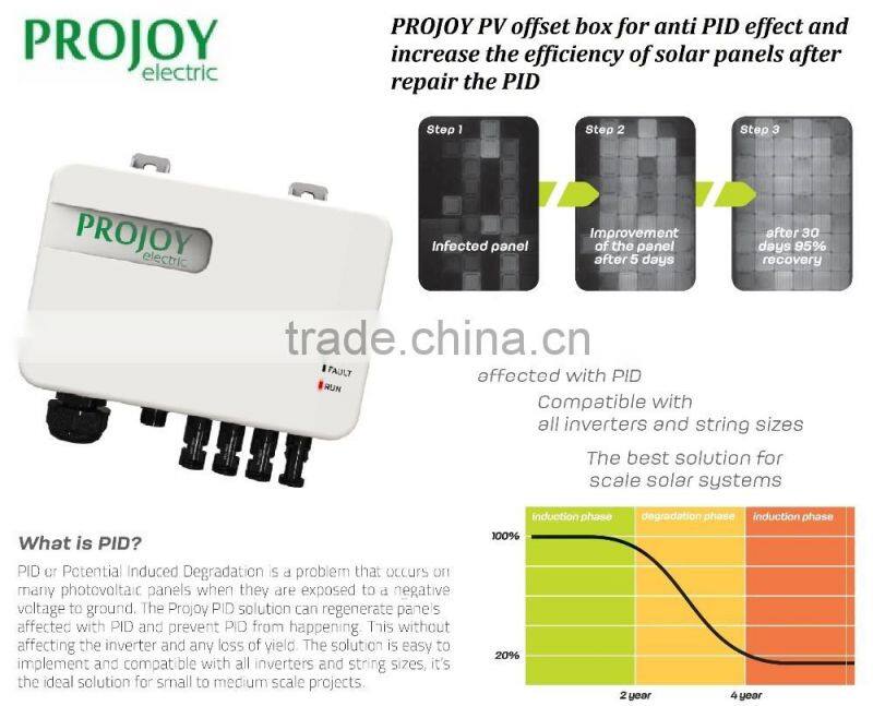 Projoy PID offset box is the best solution for anti solar panels PID effect and 98% recovery is witnessed by several independent test laboratories. This solar PV offset box is especially needed in costal , sand storm and high temperature & humidity area to resist PID effect decreasing.