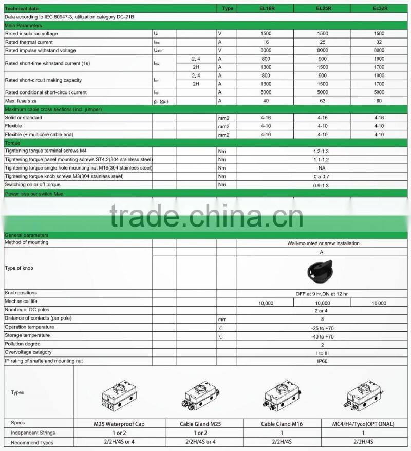 DC Isolator Switch enclosure IP66 PV solar 1500V 58A with MC4 connector