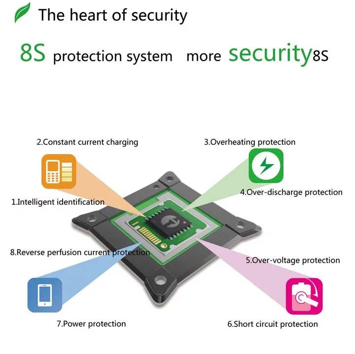1. Exclusive patent of 8S security system(intelligent identification;constant current charging;overheating protection;over-charging protection;over-voltage protection;short circuit protection;power protection;reverse perfusion current protection);