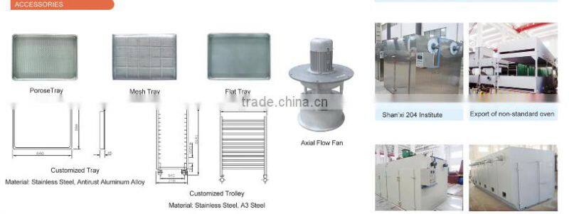 The drying oven is suitable for drying and dehydration of material and product for pharmaceutical, chemical, food, agricultural, aquatic, light industry, heavy industry; such as medicine raw material, medicine, Chinese herbal medicine, extractum, granules, powder, pill, packing bottle, pigment and dyes, dehydrated vegetables, dried fruit, sausages, plastic, resin, electric elements, varnish, and etc.