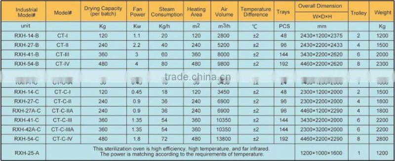 This product is equipped with low noise, high temperature proof axial flow blower and automatic temperature control system. The entire circulating system is fully sealed and it increased the thermal efficiency (traditional ovens 3%-7%, current oven 35%-45%), the highest thermal efficiency can reached 70%. The technology of the hot air circulating oven is advanced level in world. It is an energy saving product and it has improved the economic benefits for a lot of Chinese manufacturers. In 1990, the Chinese Medical Management Bureau has issued the industry standard for the drying oven and the standard model number is RXH.