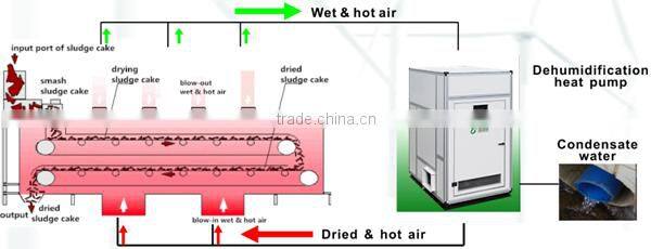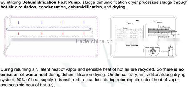 Heat pump type low temperature sludge dryer can achieve the treatment of "reduction, stabilization, harmlessness and reutilization". Final sludge granules can be used as fuel, incineration, construction materials, biological fuel, etc. It is applicable to dry all kinds of sludge, such as municipal, dyeing, papermaking, electroplate, chemical, leather etc, even the sludge with abundant sand can be dried.