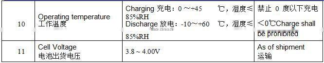 If the cell is to be stored for 3 months or longer it should be held in a dry and cool environment. Voltage during storage needs to me maintained between 3.6V~3.9V and the storage conditions are the same as 20±5℃.