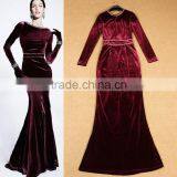 2015 Latest Celebrity High-end Simple Designs Elegant Beaded Long Sleeves Fishtail Maxi Long Velvet Dress For Party