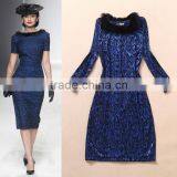 Sexy Ladies Lace Bright Blue Long Sleeve Slim Evening Dress With Fur Collar Fashion Designer Wholesale C17132
