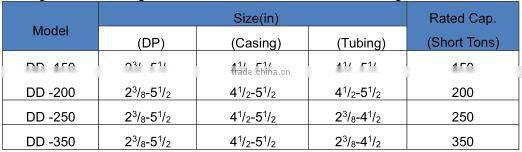 Model DD center latch elevator with square shoulder is suitable for handling drill collar, casing and tubing. The load ranges from 150 tons to 350 tons. The size ranges are from 2" to 5 1 / 2 ".