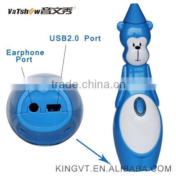 7. USB: use standard USB connect to computer, can recharge the battery, or download new stories or music to VaTshow Reading Pen