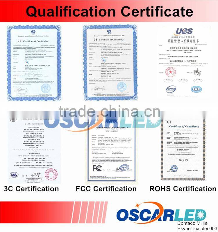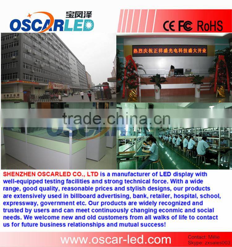 Shenzhen Oscarled Co., Ltd. is a professional LED display manufacturer in China. Our company is engaged in research, production, sale and technical service together. We have rich experience in LED display industry. As one of the outdoor full color LED display and indoor LED screen leading manufacturers, we have professional R&D teams and after-sales service teams. Our products include taxi top led display ,outdoor full color LED displays, indoor full color LED displays, dual-color and single color LED displays, stage background LED screens, rental LED screens, traffic LED signs, curtain LED displays and so on. Our LED displays are widely used for advertising billboards, banks, retailers, hospitals, schools, expressways, governments, etc. We have won praise from domestic and overseas markets for our top-class quality and competitive products. Producing high quality, high technical and lower price LED display screens for our customers will still be our development goal.