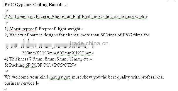 Name:PVC Laminated Gypsum Ceiling Board WITH RH95%,NRC 0.55,LR90,Best quality with good hardness and light weight