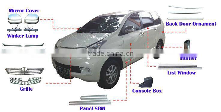 Products including: auto rearview mirror, rearview mirror cover, grill, grill decorative strip, back door ornament, console box, tail pipe, mud guard, doorsill strip, windows, gas tank cover, door handle cover series, handle bowl, fog lamp cover, tail lamp cover, emblem, door SBM, stainless steel muffler, license plate garnish, cargo cover, car cover etc.