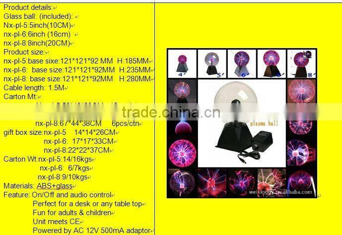 The plasma lamp is a super artwork of high-new technology. plasma globe or plasma lamp (also called plasma ball, dome, sphere, tube or orb, depending on shape), is (usually) a clear glass orb filled with a mixture of various noble gases with a high-voltage electrode in the center of the sphere. Plasma lamps are mainly used as curiosities or toys for their unique lighting effects and the "tricks" that can be performed on them by users moving their hands around them. They might also form part of a school's laboratory equipment for demonstration purposes. They are not usually employed for general lighting. However, as of recent years, some novelty stores have begun selling a nightlight plasma lamp that can fit into a standard light socket. |