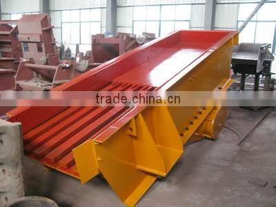 The electromotor drives the eccentric block of the exciter to rotate with high speed through the v-shaped belt. The eccentric block can produce big eccentric force, and the exciting screen box will do circular motion with certain amplitude. The materials on the slant screen will be influenced by the impulse transmitted from the screen box and do continuous throwing motion, and the materials smaller than the screen hole will go through the screen, thus realizing classifying. we supply mining feeder for iron ore feeding,copper ore/gold ore feeding .