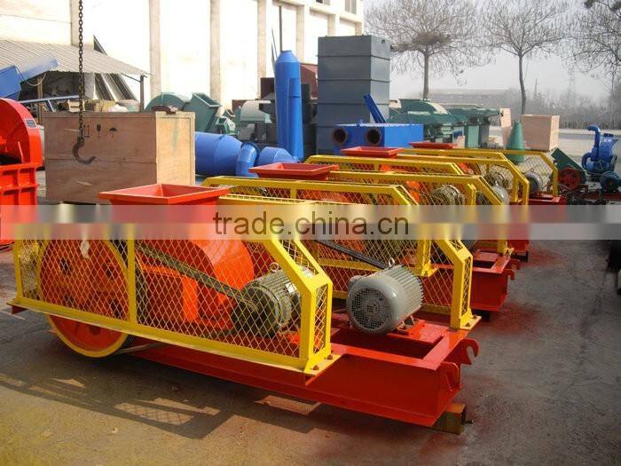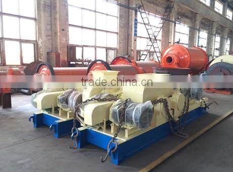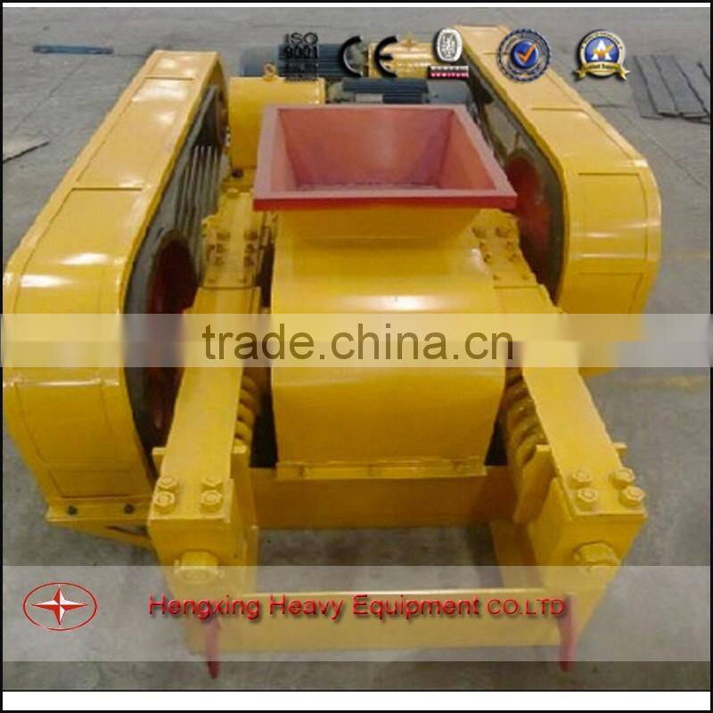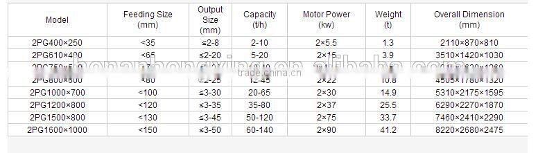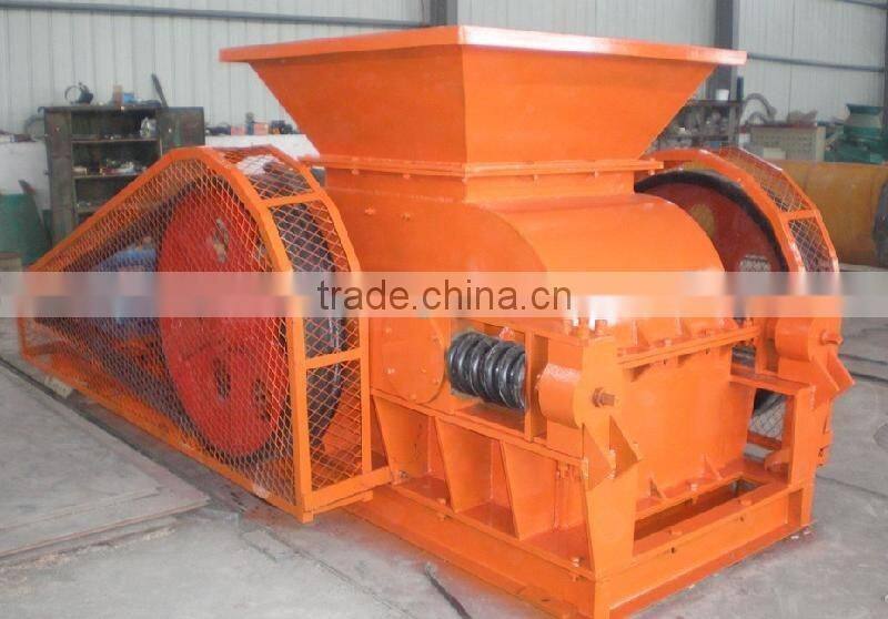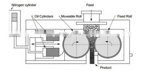 The fixed part of roller and movable roller are driven by the motor via reducer and v-belt, the raw materials fall into the part between the two rollers from inlet of the machine. The two rollers rotates inward simultaneously. The materials are extruded, crushed and ground, then the end products come out from the bottom of this roll crusher.